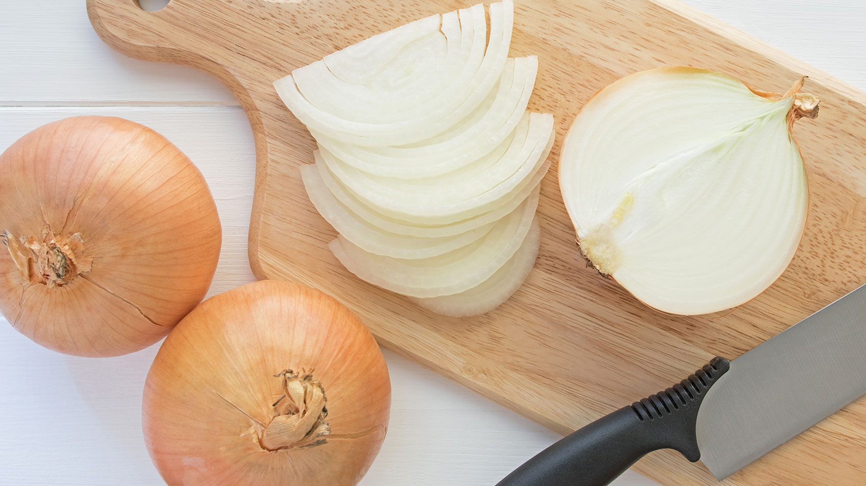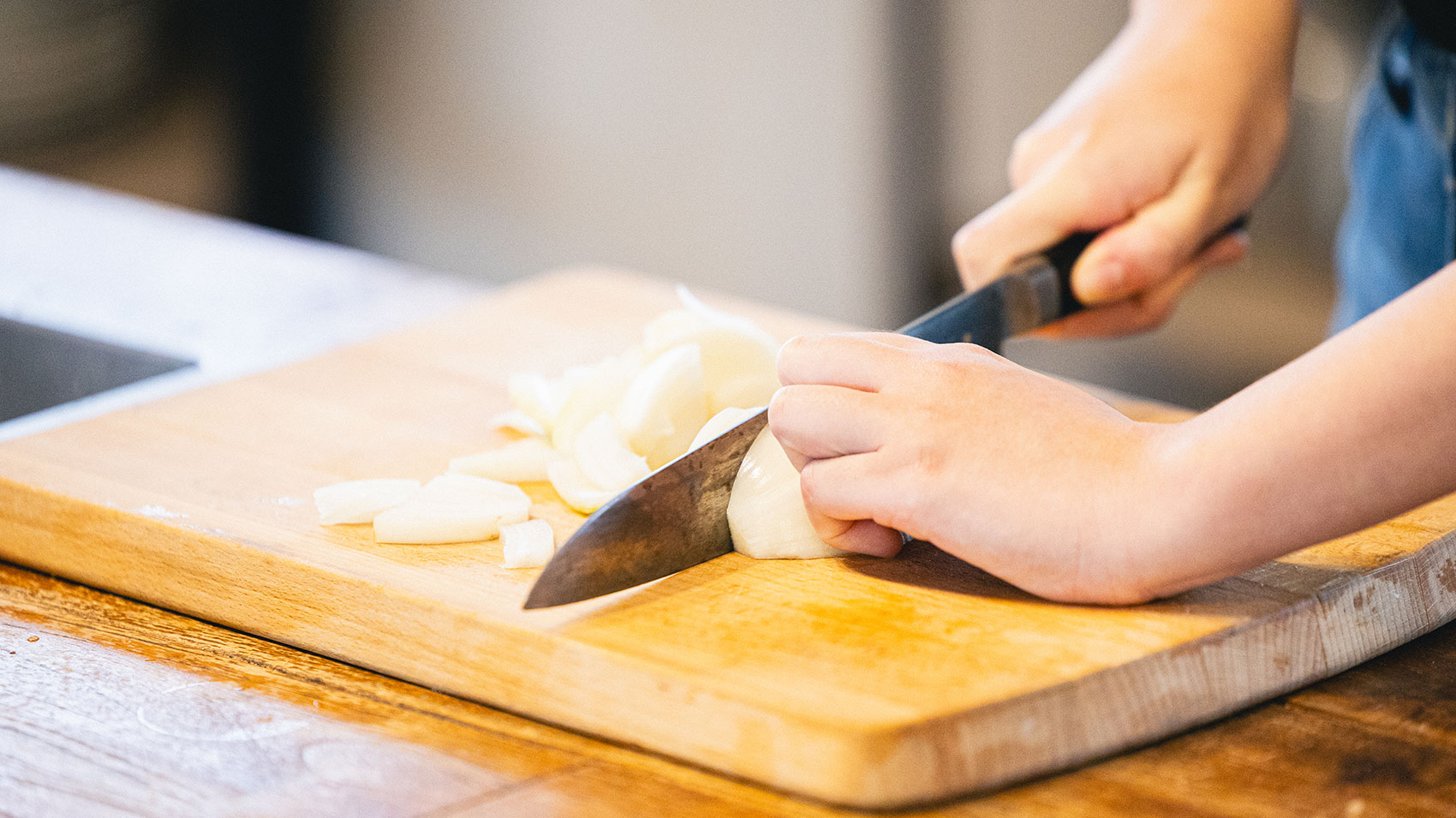 それでは、次は玉ねぎを切っていきますよ!今回は、玉ねぎとかつお節がメインの具材で、玉ねぎの食感も残したいので、まず繊維を断つように玉ねぎを半分に切り、そのあと、繊維に沿って同じ幅のサイズ感で切っていきます。