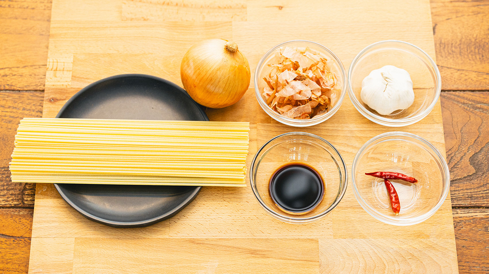というわけで、今日は今お話ししたようなところを踏まえて実際にお料理をしていきますよ!それと、今回作るお料理は「玉ねぎとかつお節の和風ペペロンチーノ」ですので、このベースのペペロンチーノができたら、和風にするためにかかせないお醤油が登場します!