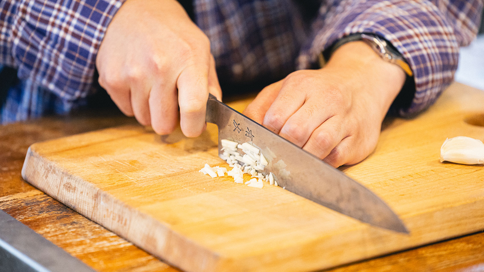 CASTさん:その通りです!繊維を断つように切るんですが、今回はより香りやうま味が出るようにみじん切りにします!では早速みじん切りにしていきましょう!ここでのポイントは、このあと加熱のために、にんにくの大きさをできるだけ揃えて切ることです。