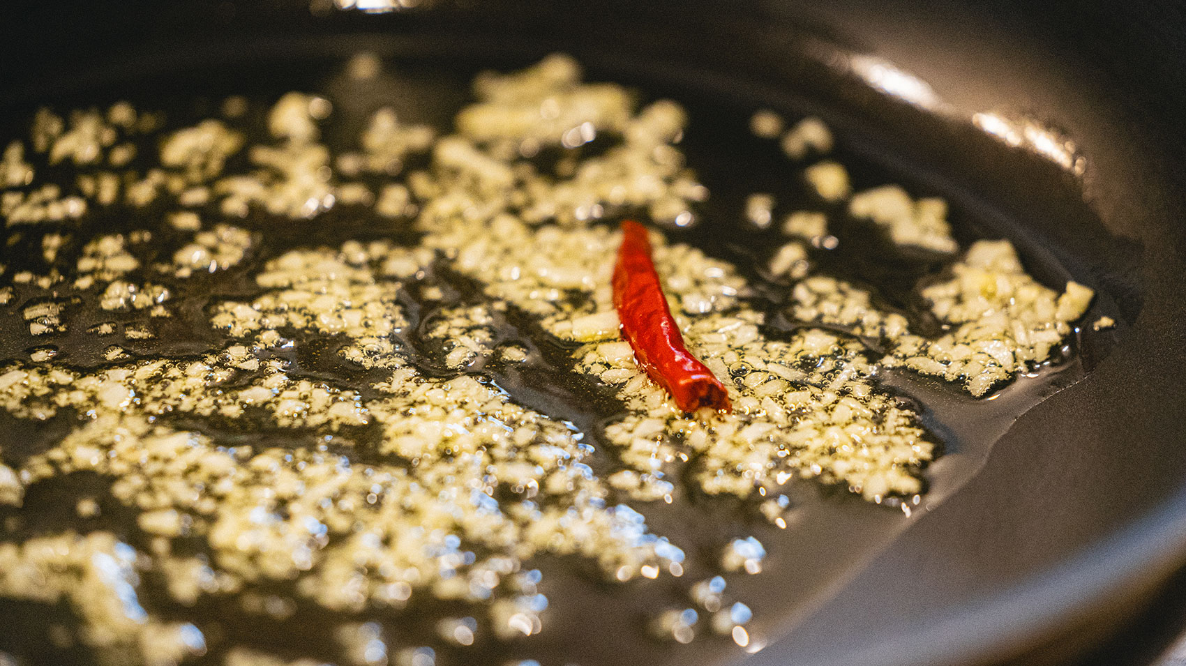 あとは、唐辛子の辛さも少し加えるために、フライパンに入れて、にんにくが浸るくらいにオリーブオイルを入れたら、じっくり加熱していきますね!