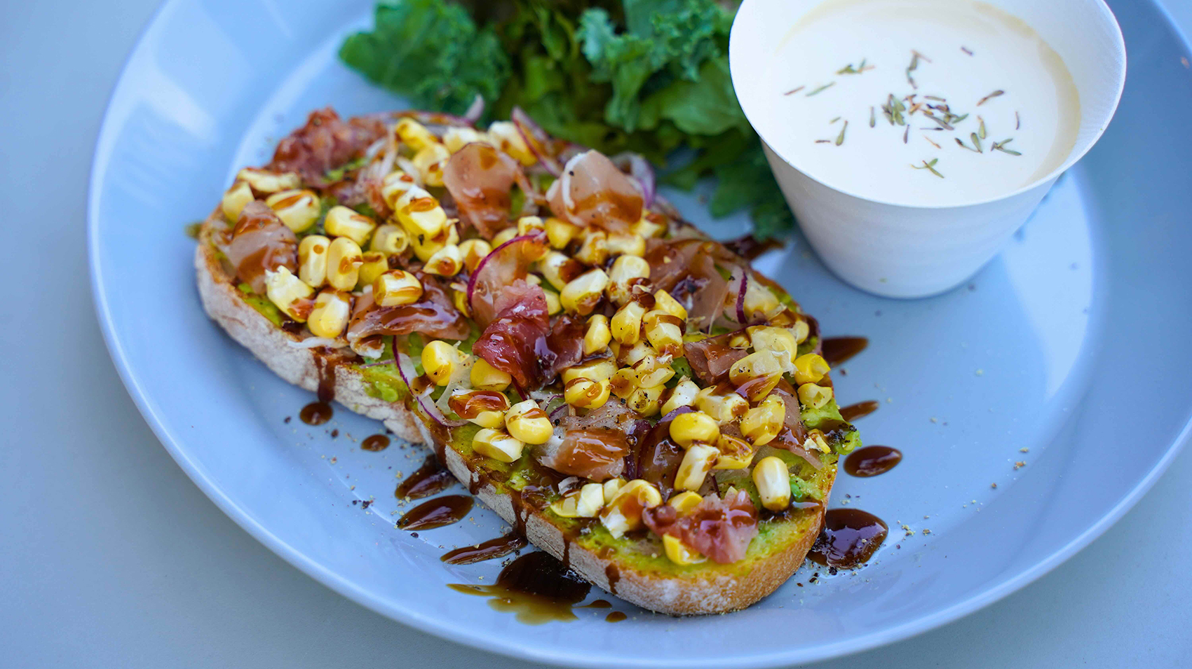オープンサンドをひと口食べると、ジューシーで甘い生とうもろこしのシャキッとした歯応えが広がります。そこに生ハムの塩味、アボカドのまろやかさ、バルサミコソースのフルーティーな酸味と風味が絶妙に調和することで、八ヶ岳生とうもろこしの甘味を引き立てていました!