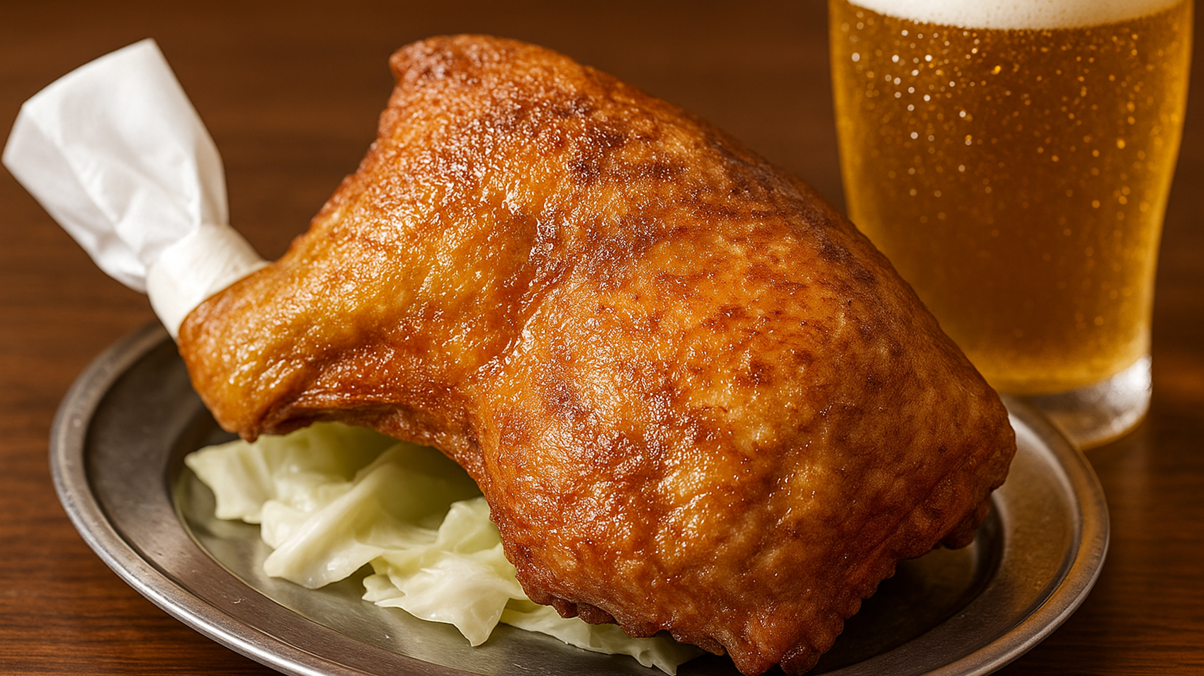 揚げ足鳥は、鶏の足 -つまり骨付きもも肉を豪快に高温の油で一気に揚げ上げるのが特徴です。皮はパリパリに仕上がり、ひと口かぶりつけば中から熱々の肉汁があふれ出し、鶏本来の旨みが広がります。