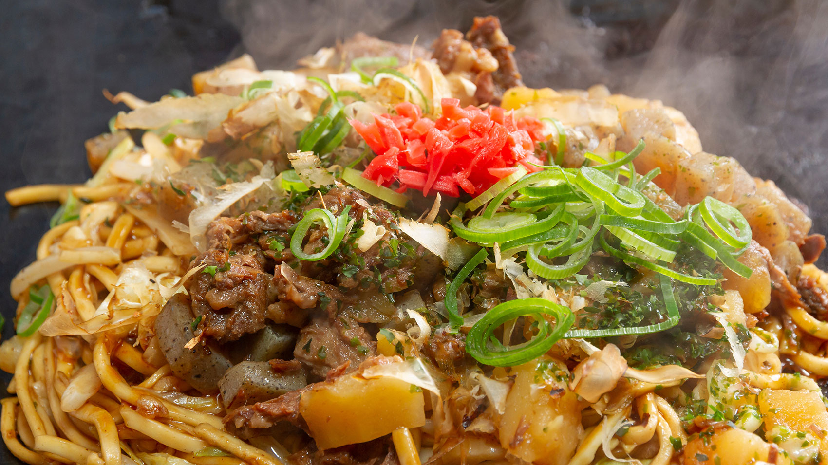 語源には諸説あり、煮汁や煮込んだ具を “ぶっかける”がなまって “ぼっかける”となったことが由来という説があります。今回のメニューは、この「ぼっかけ」を、香ばしいソース焼きそばにたっぷり絡めたもの。世界中に知られている神戸ビーフほどの派手さこそありませんが、庶民が守り続けてきた濃厚な生活の味です。