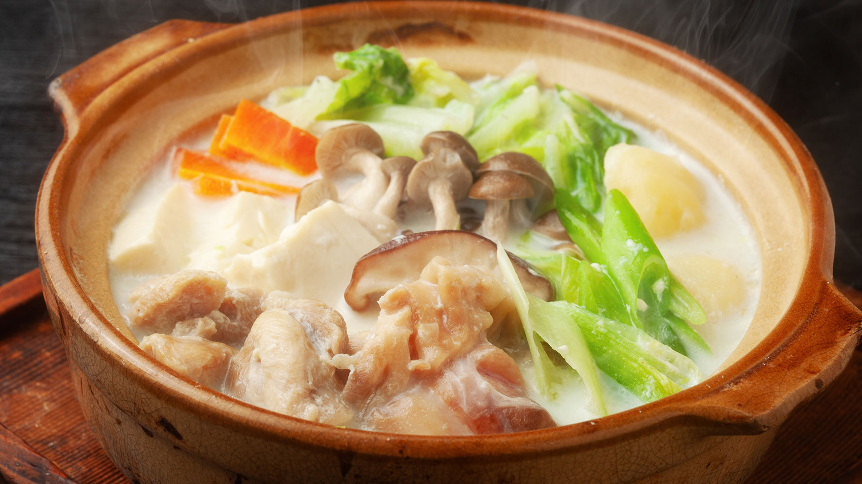 鶏がらだしに白味噌と牛乳を合わせ、鶏肉、白菜、ねぎ、ごぼう、にんじん、しいたけ、豆腐、春雨などをじっくり煮込む今のスタイルが徐々に定着。仕上げにはおろし生姜や一味唐辛子を添え、ときには溶き卵につけて食べる。滋味深いのに軽やかで、食べ飽きない味わいに、家庭や店ごとの工夫が光ります。